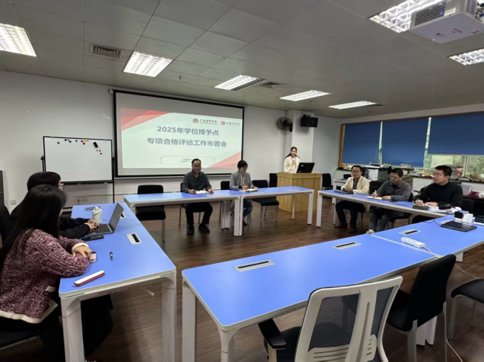2025年翻译硕士学位授予点专项合格评估工作在即,2025年11月5日下午,桃子视频 在校本部综合楼304召开会议,布置迎评工作。学院党委书记韦建辉、院长曹治柳、副书记黄万获、副院长吕晓敏以及教研科、MTI教育中心、学生工作办公室人员参加会议,吕晓敏主持会议。